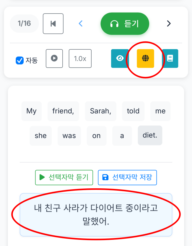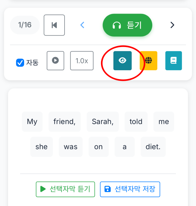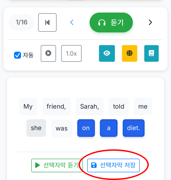 잘 안 들렸거나 몰랐던 단어를 클릭하면 파란색으로 강조 표시됩니다. 선택이 끝나면 버튼을 눌러 저장하세요.