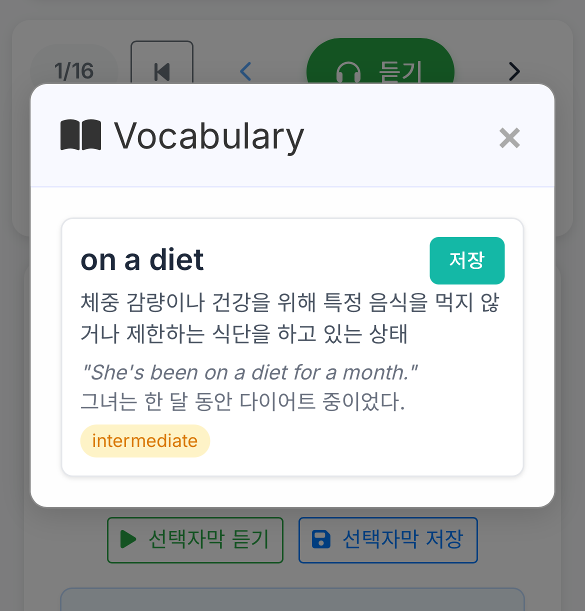 버튼을 클릭하면 현재 자막의 주요 단어와 표현에 대한 설명을 볼 수 있습니다. 단어의 뜻, 예문, 사용 맥락을 확인하고 버튼을 눌러 나중에 복습하세요.