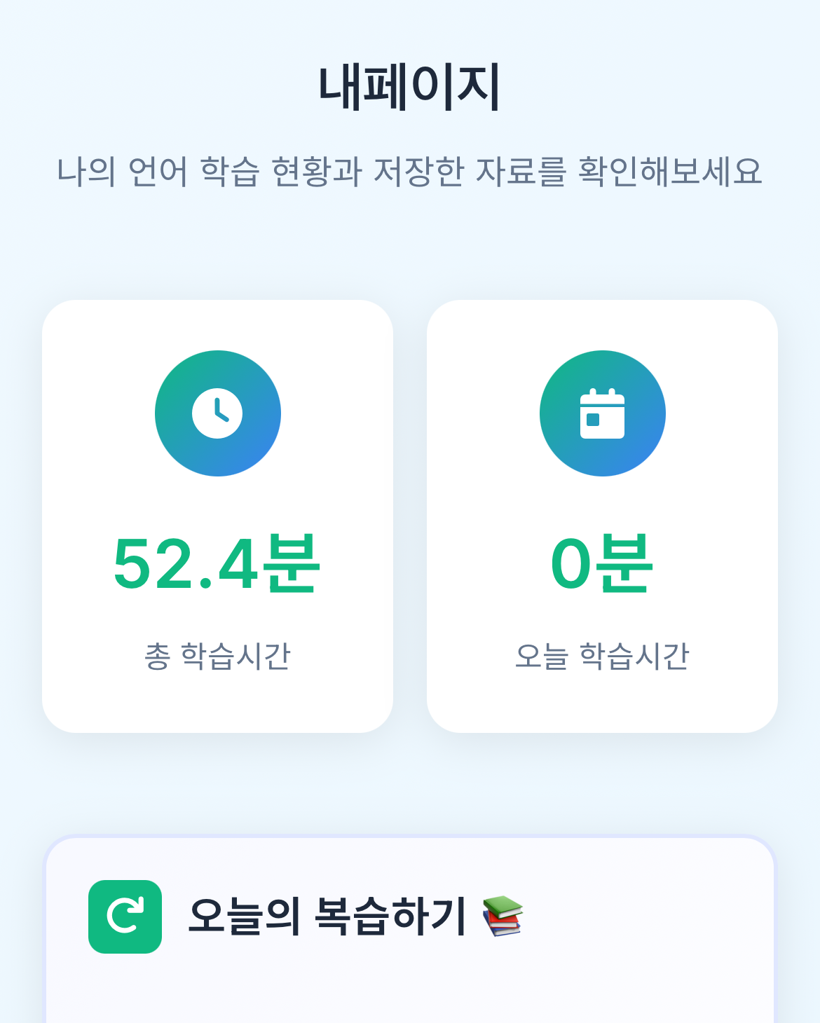 학습이 끝난 후 상단 메뉴의 내 페이지 에 방문하면 저장한 어휘와 어려웠던 구문을 한눈에 볼 수 있습니다. 간격을 두고 반복 복습하면 장기 기억으로 전환됩니다.